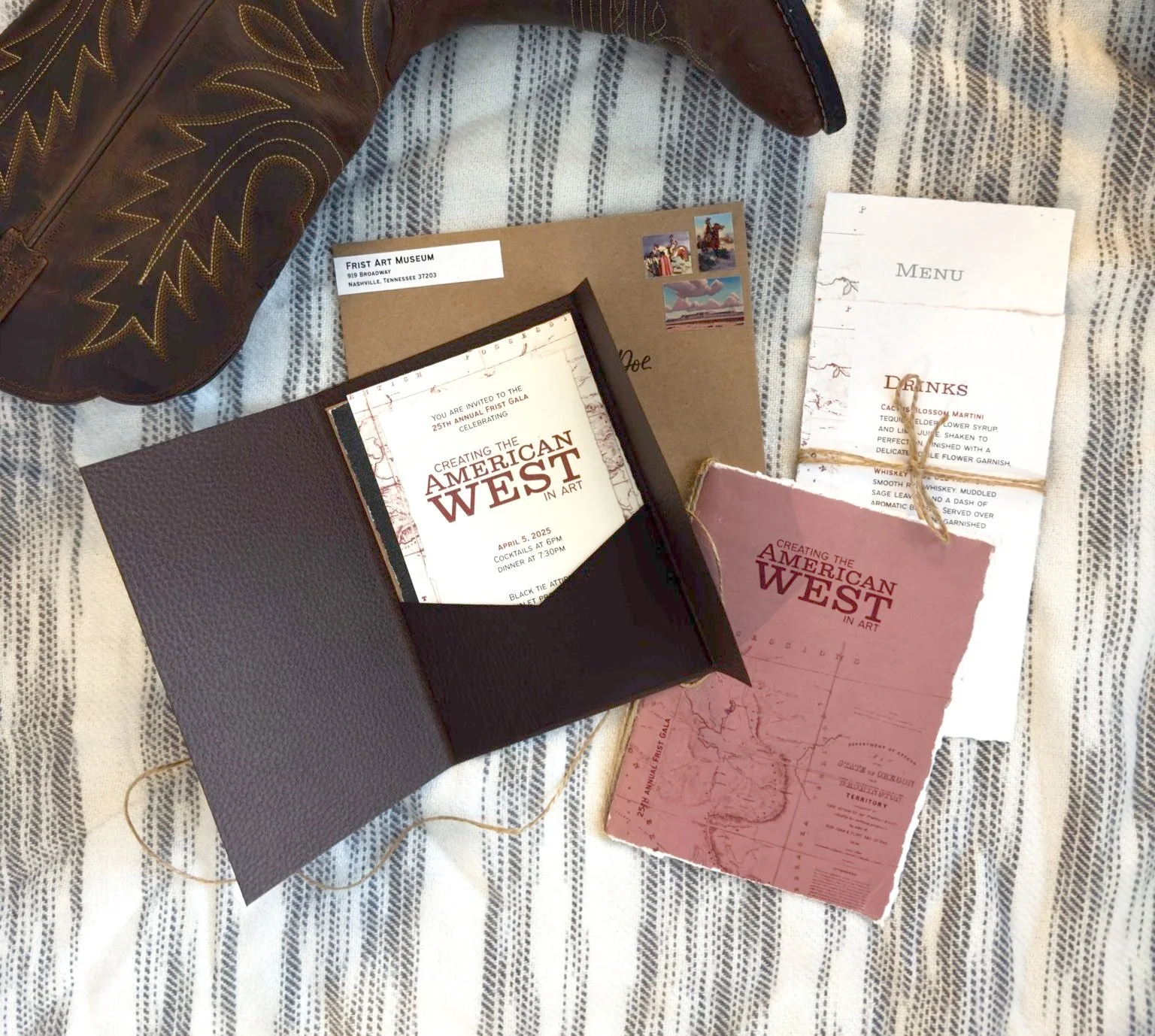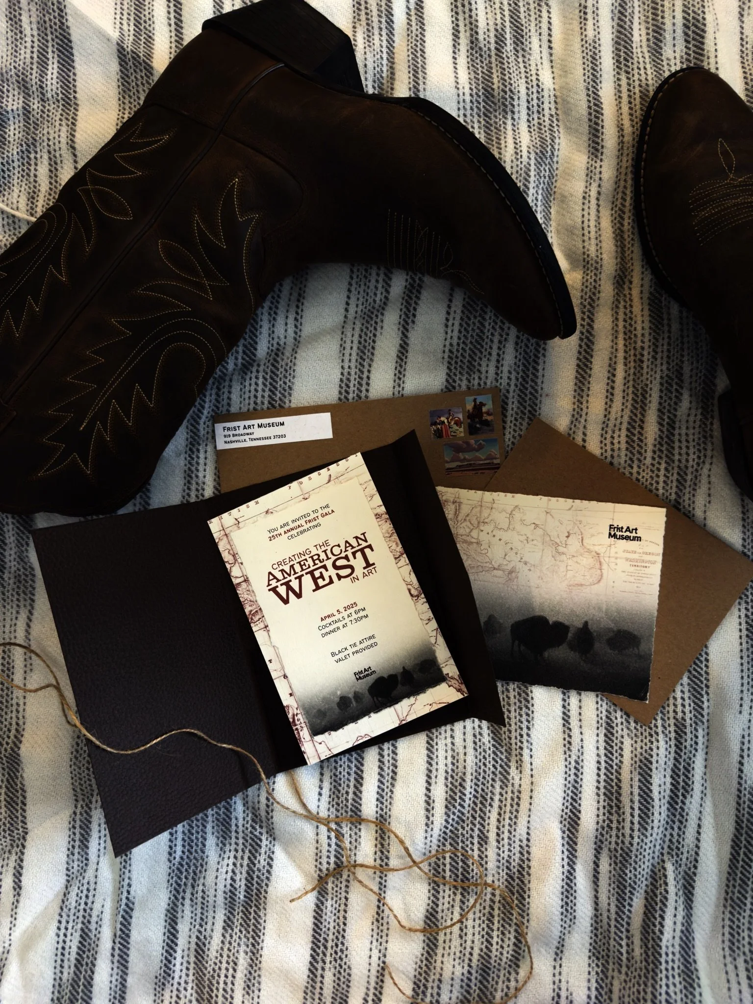 Every year, the Frist Art Museum hosts a fundraising gala themed on one of the exhibitions. My chosen exhibition was “Creating the American West in Art,” which highlights the complex past of the American West. The pieces for this event drew inspiration from old west maps, twine, and leather, creating a palette from a featured piece in the exhibition.