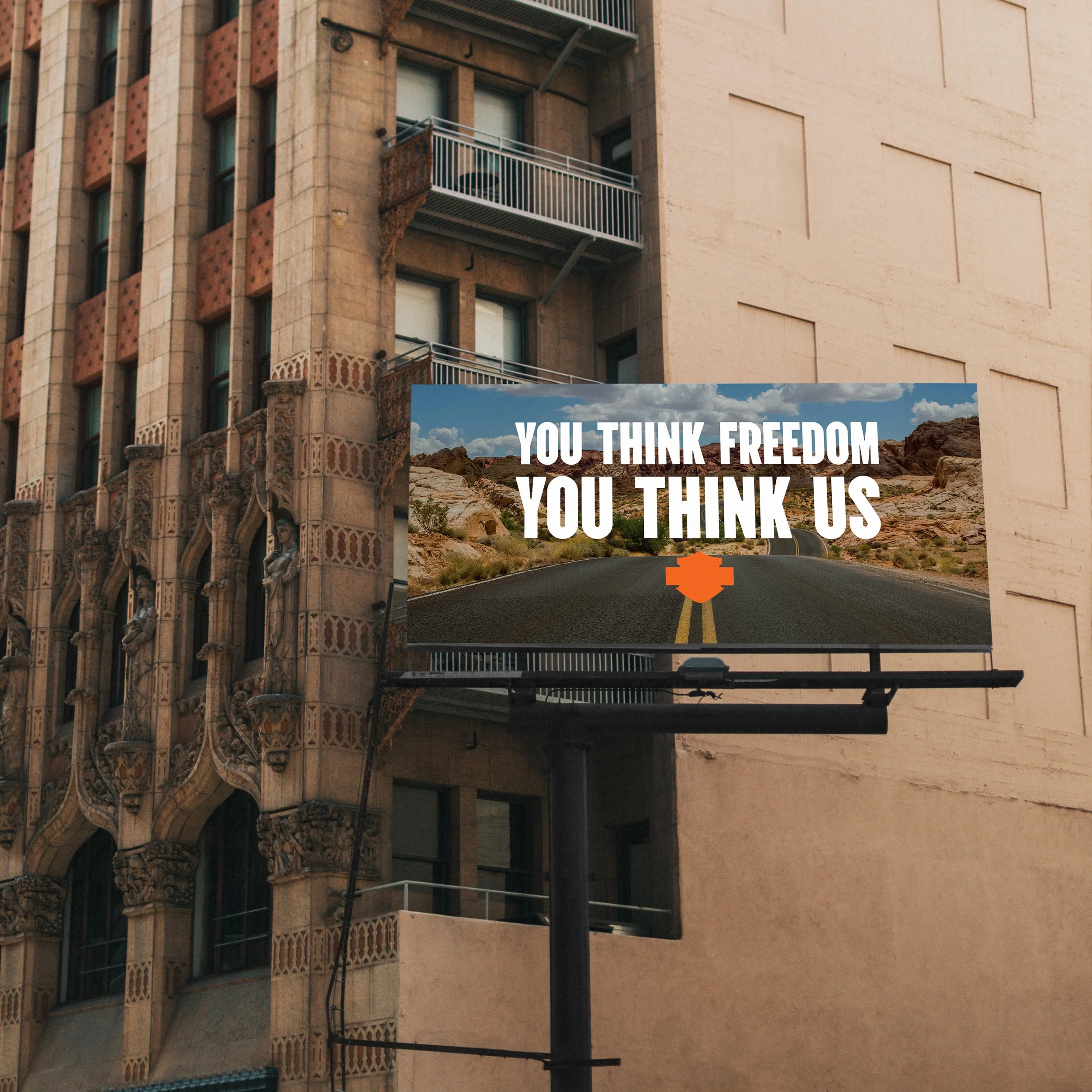 The essence of Harley-Davidson can be boiled down to its borderline arrogant attitude, based on the knowledge that when people think of motorcycles, they think of Harley engines, Harley chrome, and Harley orange. By leaning into this attitude, the You Think of Us campaign was born. Meant to target other motorcycle companies, these ads are intended to be placed in plain sight of other dealerships, like the sidewalks outside or on a billboard across the street.
